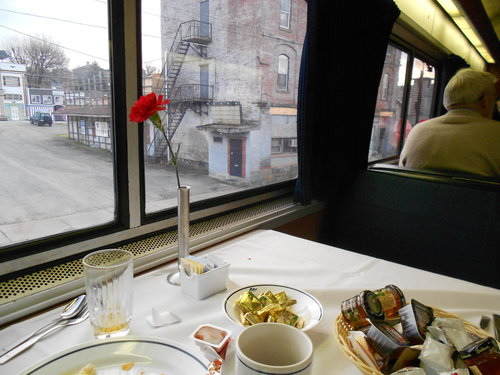 在美國國鐵列車上用餐比較特別的是, 不能自己選座位, 服務人員帶你坐哪你就坐哪, 通常會跟陌生人同桌, 用餐時一定得和陌生人閒談, 否則就太尷尬了...