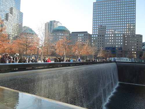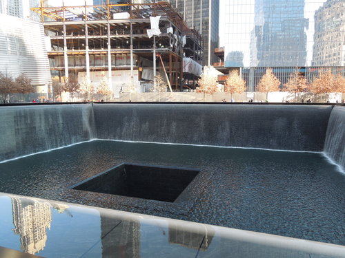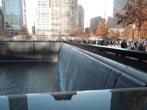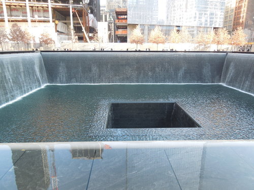 水池面積有四千平方公尺, 水流象徵著在這場悲劇中逝去的生命, 強大的水聲帶走城市的喧囂, 讓訪客在此沉思默想。