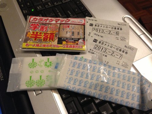 在日本逛幾天下來, 拿了不少面紙, 原來台灣商家在街上發面紙的行銷法就是跟日本學的... 還在各餐廳拿了很多濕紙巾, 看來日本人真的很愛用濕紙巾。