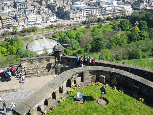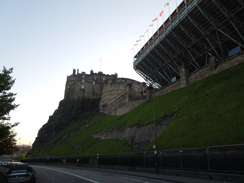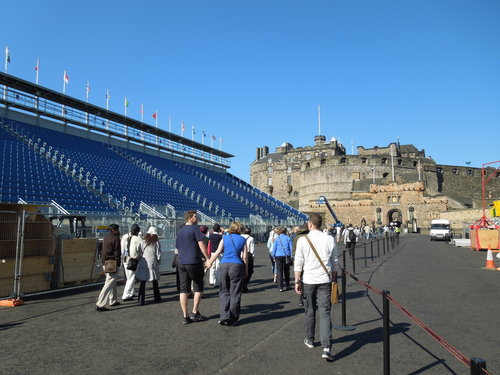 Edinburgh Castle 建在死火山的岩塊上, 居高臨下俯瞰愛丁堡市區。 圖右類似足球場的座位是用來觀賞每年八月份國際藝術節期間的軍樂表演。