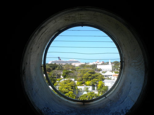 快到頂了! 從窗戶可以遠遠看到停在岸邊的大郵輪。