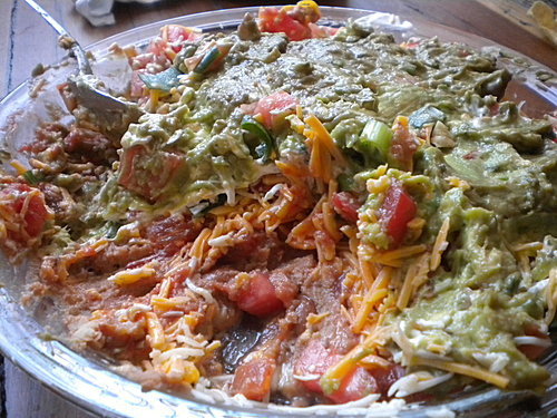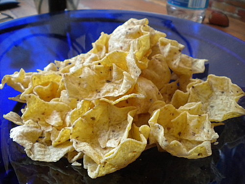 玉米脆片本身除鹹味沒甚麼味道, 一定要沾醬吃, 通常是騷莎醬或這種自製的酪梨醬, 裡面除了酪梨還有豆泥, 番茄, 起士, 酸酪等等。
