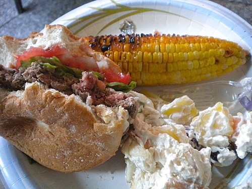 烤啥? 烤漢堡肉, 烤玉米, 也有人烤雞肉, 但好像還是漢堡居多。 主食還沒熟要幹嘛哩?