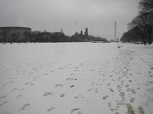 就在國會山莊另一頭的華盛頓紀念塔 Washington Monument 後頭施放, 國會山莊和紀念塔間這塊草地覆蓋的大空地叫做 National Mall, 冬天就是這模樣。 好幾年以前就想到這裡看煙火, 但是大批人潮總是讓我打退堂鼓, 今年拼了!!