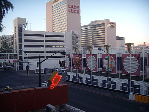 終於到了賭城的舊市區... 怎麼這麼陰森.... 路上沒人又沒車, 這棟 Lady Luck 賭場也已經沒有營業了...