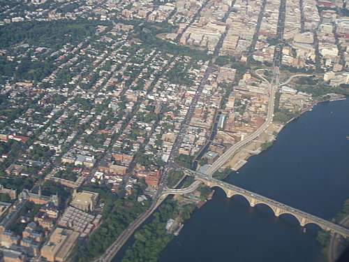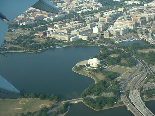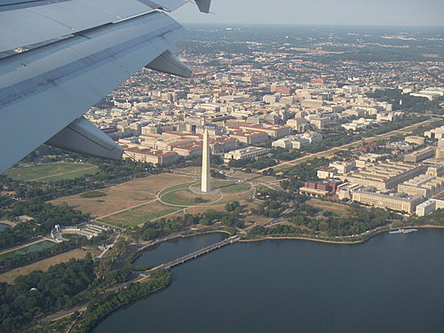 雷根國家機場一起飛, 華盛頓市中心馬上進入眼簾, 尖尖的那個是美國國父華盛頓紀念塔, 也是華盛頓市內最高建築。