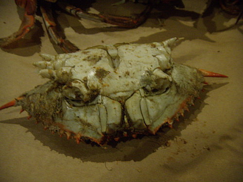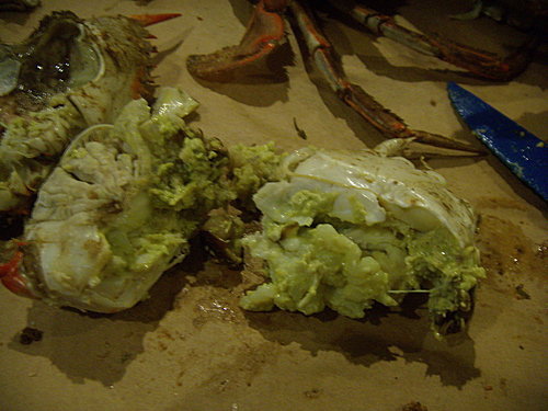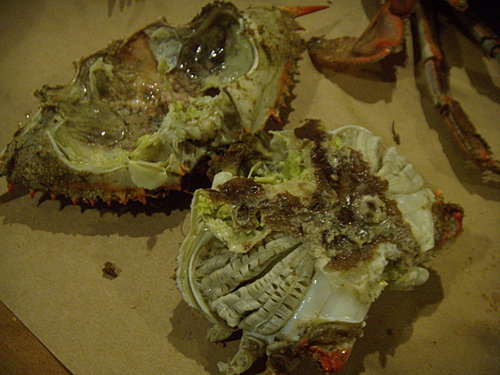 在朋友的指導下, 先將蟹腳都拔除敲爛吃淨, 再來解剖身體的部份.......