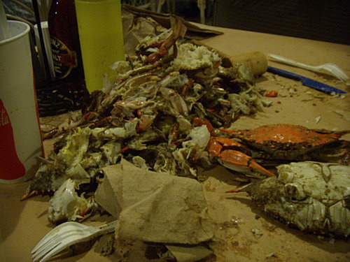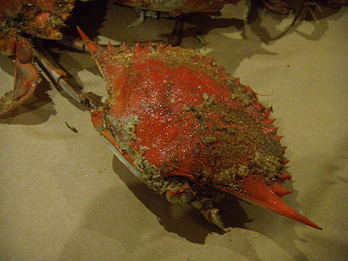 來到一家朋友的朋友推薦的餐廳, 桌上沒有華麗的桌巾, 而是一層褐色的厚紙, 跟台灣辦桌時桌上舖的紅色塑膠袋有異曲同工之妙~ 蒸好的螃蟹就這樣直接倒在桌上, 還附大榔頭一支, 方便你敲碎蟹殼, 用力吸允裡面的蟹肉。