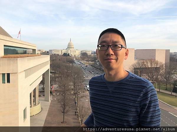博物館變身的新校舍在華府的賓州大道上, 美國國會山莊非常近, 就是阿甘後方那一棟圓頂建築, 大家都一眼可以認出來吧? 這是新聞博物館仍在營業時拍的照片, 阿甘站在博物館陽台上。