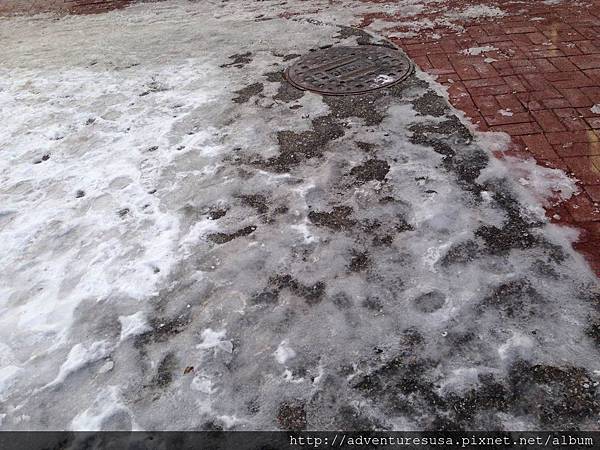即使氣溫在冰點以下, 白天陽光照射到的地方積雪還是會融化少許, 等太陽下山後結成冰, 路上到處是這種結冰的表面, 很滑很可怕。