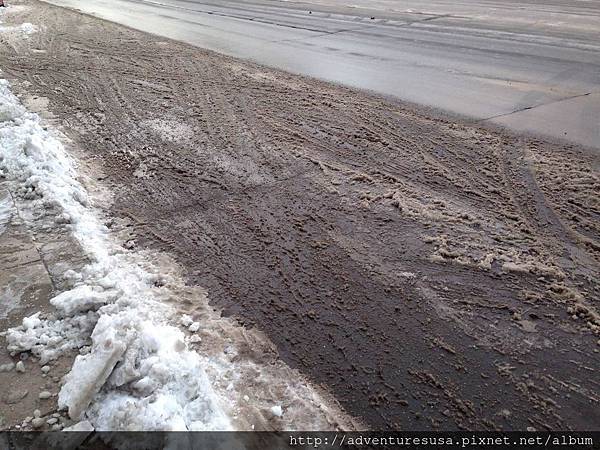 政府的除雪車會用化學藥劑把路面上的雪融化, 各種車輛來來往往, 塵土油漬混合融雪, 創造出新口味思樂冰。 看似高雅純潔的白雪, 好輕易的就被玷汙了.....