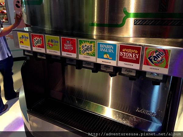 可口可樂公司不只有可樂產品, 他們也出其他汽水像是芬達, 雪碧, 還有紅茶、礦泉水等等等。 這些可樂機根據全球五大洲來區分, 世界各地可口可樂公司出產的飲料都喝得到, 非常有趣。像上圖都是非洲國家的產品, 有烏干達 南非 辛巴威 坦尚尼亞 馬達加斯加等國家。南非的產品叫做畢波 Bibo!! (想到潘迎紫... 呵)