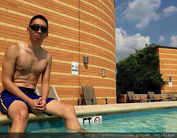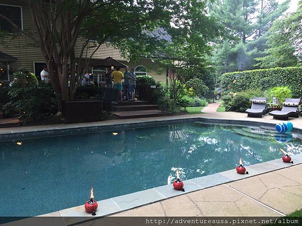 另一位朋友自家後院有游泳池, 還能控制水溫。