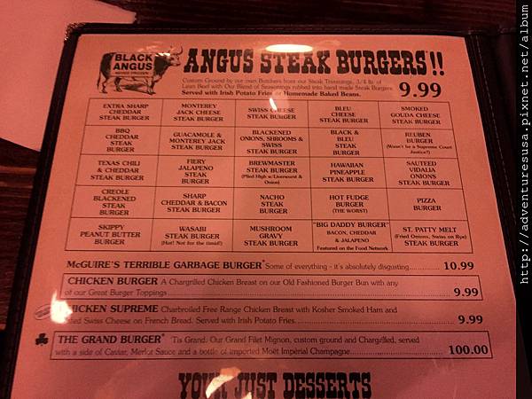 $9.99 美金的漢堡也搞怪, 有哇沙比口味, 披薩漢堡, 辣椒漢堡, 夏威夷鳳梨漢堡等等, 還有一百元的超級漢堡。