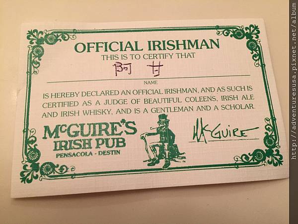 餐點用畢, 餐廳還發一張愛爾蘭人證書。 阿甘變成 Irishman 了!