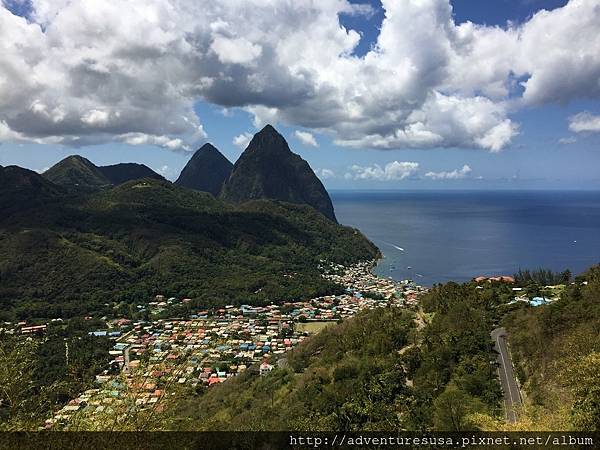 一座高771 公尺, 另一座 743 公尺, 雖然不是很高, 但尖尖的山頭豎立在海邊非常壯麗。 下面山腳下的村落叫做Soufrière, 人口八千左右。
