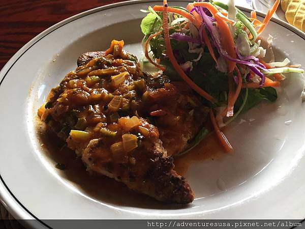 點了一道煎魚, 配上熱帶水果醬料, 鮮美可口。