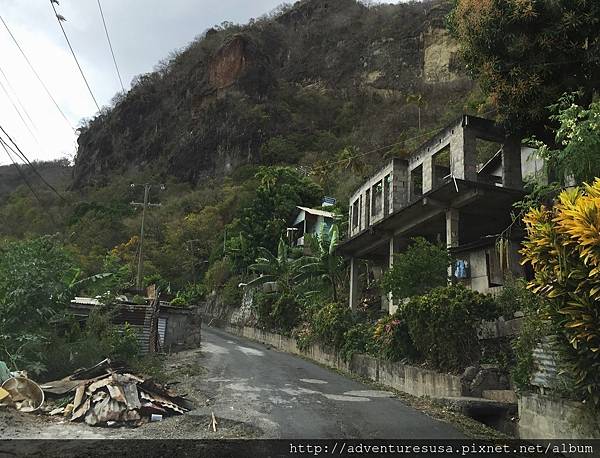 Soufrière 市區內道路陡又窄, 很多廢棄或破爛房屋。