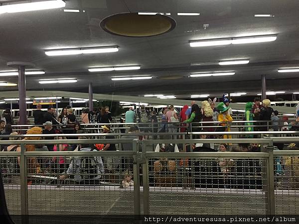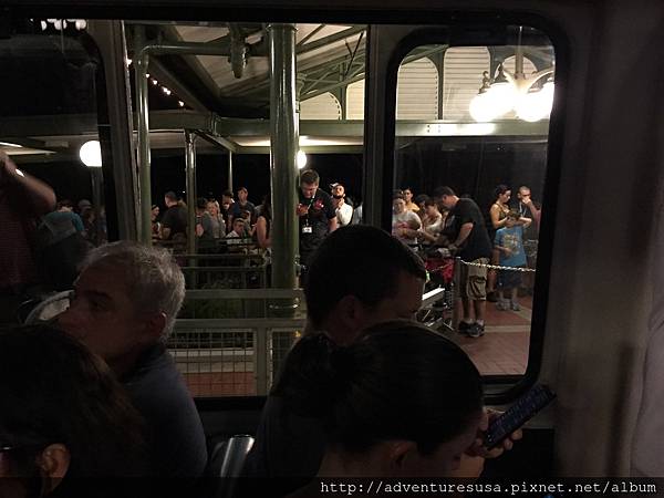 傍晚離園的時候搭乘輕軌去停車場, 結果系統故障, 一堆人呆坐在車廂裡等待。