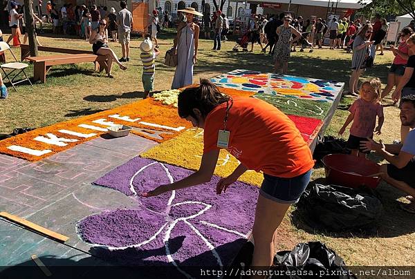 這些五顏六色真的是花瓣喔, 工作人員正仔細地舖上去。