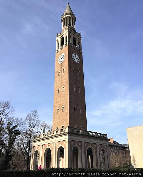 今日的教堂山北卡大學有將近三萬名學生, 其中一萬八千是大學部學生。這座鐘塔 Morehead-Paterson Bell Tower 高 52 公尺, 是校園內最醒目的建築物之一。