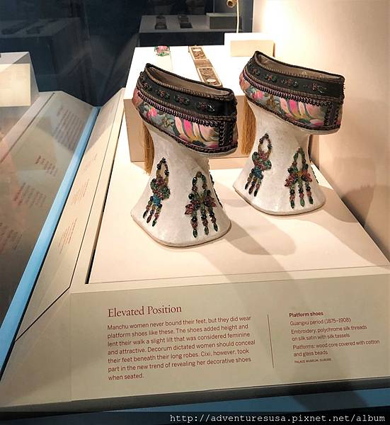 墊高的鞋, 看起來不太好走啊! 當時裹小腳的都是漢人, 滿人女性不裹小腳。