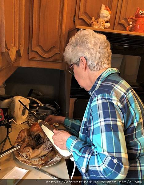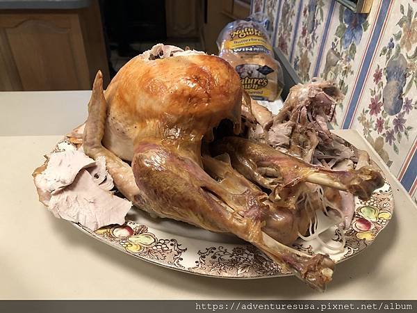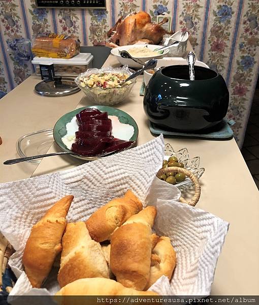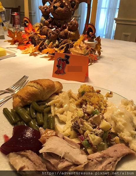 火雞, 火雞填料, 紅莓醬, 青豆, 洋芋泥, 餐包... 等等感恩節傳統菜餚都上桌了。