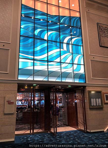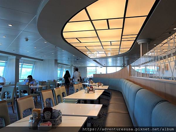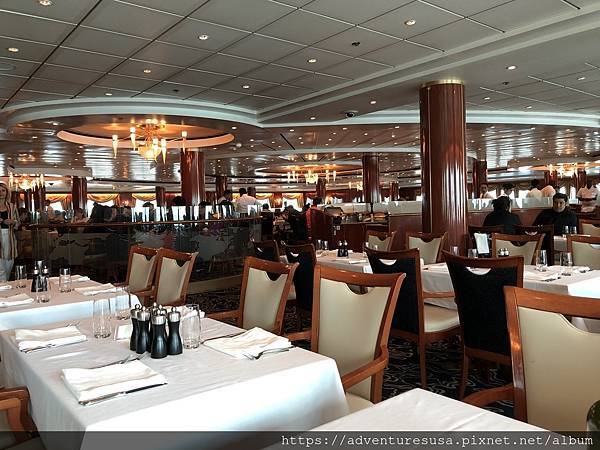 搭郵輪的一大重點是吃! 五樓船尾是主餐廳 Seven Seas。