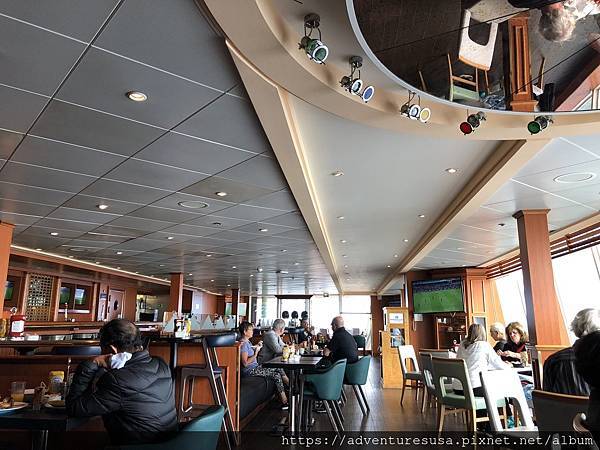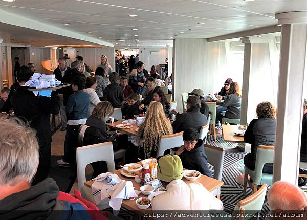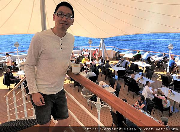 但是太陽號的自助餐廳有個超大缺點: 空間不足, 每天午餐時刻都這樣擠爆。尤其一半以上時間天氣寒冷, 大家不想坐在外面吃, 全擠在室內, 更是一桌難求。阿甘猜測問題出在太陽號有太多空間用在數家特色餐廳, 畢竟特色餐廳必須額外付費, 郵輪公司希望乘客去使用。下集將特別介紹船上的這些特色餐廳。