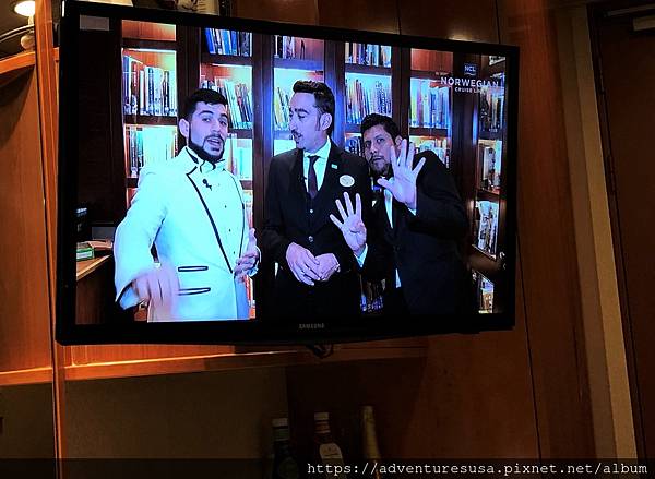 每一趟郵輪之旅都會有個 Cruise Director, 在郵輪專屬電視頻道上介紹當天所有活動, 也會在每天的晚會節目中出現舞台上, 跟大家報告重要事項和隔日行程重點等等。基本上 Cruise Director 一定是男的, 長相中上, 身材修長, 口齒清晰, 嗓音優美。郵輪多搭幾次後會覺得所謂的 Cruise Director 像是複製人, 類似讀稿機, 沒甚麼個人特色。這次南美之旅的 Cruise Director 很不一樣, 除了充滿拉丁熱力, 還一身喜感, 娛樂效果十足, 讓乏味的資訊分享變得趣味橫生。畫面中有三個人, 除了 Cruise Director, 右邊是助理, 左邊是英文翻譯, 都非常盡責。