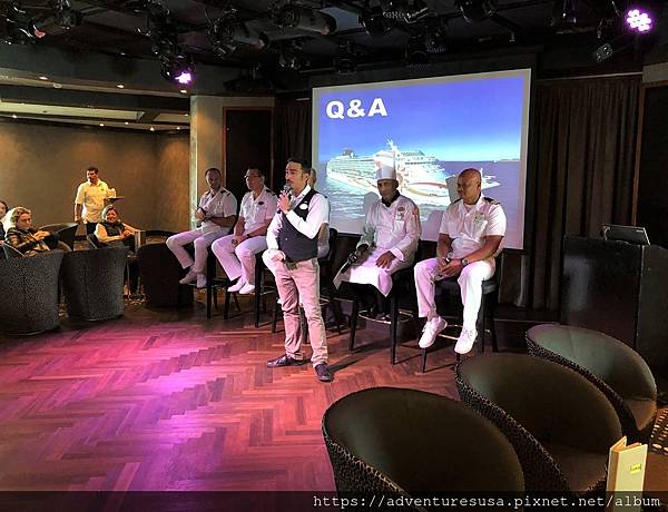 Q&A 時間, 船上的一切都可以問。阿甘的發問: 船上每天準備那麼多食物, 剩下的怎麼辦? 廚師回答說每天食物份量的計算非常精準, 浪費程度很低。