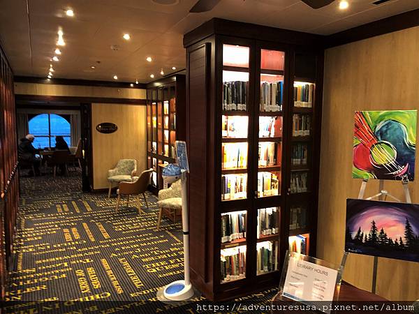 相片區旁邊是圖書室。郵輪上的網路超貴, 電視節目有限, 書本變得頗有吸引力呢!