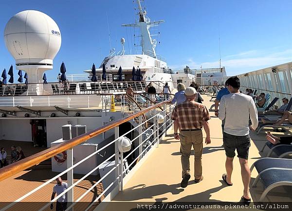12 樓有更多享受日光浴的空間, 躺了一整排人。阿甘跟船上認識的加拿大朋友散步聊天。這些年來碰過無數郵輪乘客, 加拿大人最友善熱情, 美國人次之。歐洲人最冷漠甚至無禮, 南美洲人好不到哪裡。