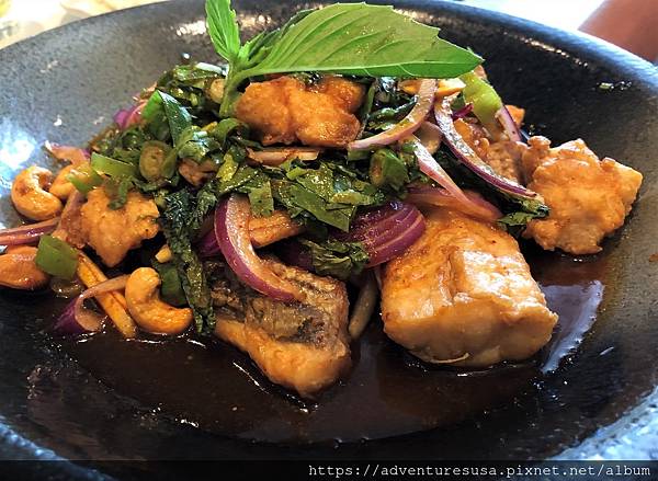 主菜 Pla Tong Na 酥脆石斑魚以檸檬葉, 香菜, 洋蔥與檸檬調味, 鹹鹹酸酸超級下飯。
