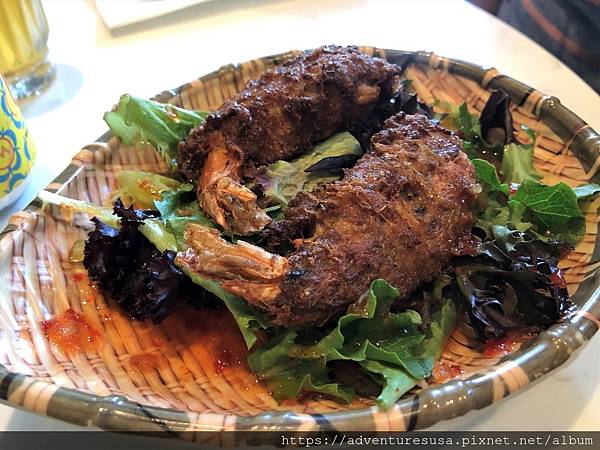 我們點的第一道前菜是 Goong Krob, 蝦肉雞肉和米線絞碎後再包起來烤, 沾甜辣醬吃。很特別也挺開胃。
