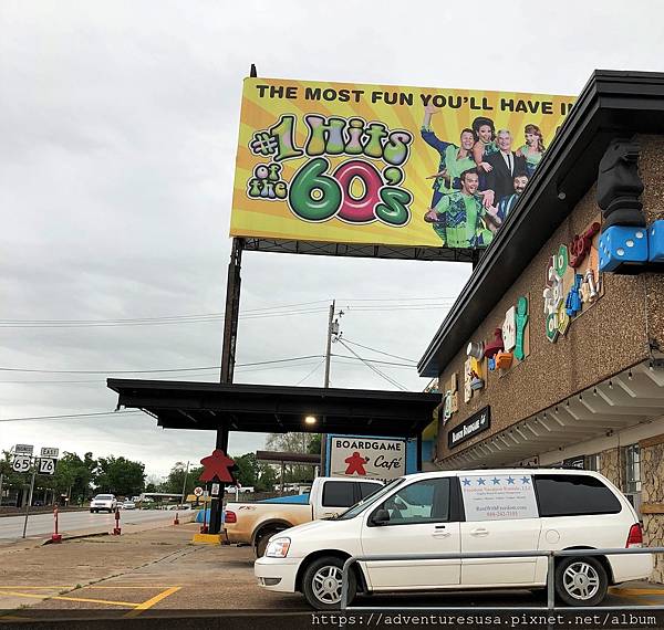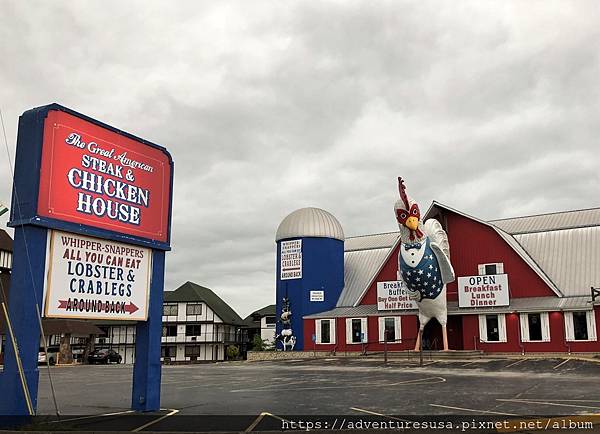 賣雞肉和牛排包肥餐, 早午晚餐都供應。怎麼一整個空蕩沒人? 因為當時疫情正開始蔓延, 商業活動禁令剛頒布。原本熱鬧熙攘的 Branson 化為鬼城。