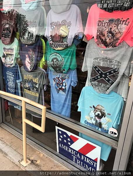 還看到不少看似宣揚愛國心但是充滿種族歧視的衣服。中間的 t-shirt 上說 shut up and stand up (閉嘴, 站起來), 是在訓斥那些以跪姿抗議警察暴力的黑人運動員。上面那款 t-shirt 寫著 I kneel for the cross (我為十字架下跪), 同樣是表達對下跪黑人運動員的不滿, 還拿宗教來護航, 很可怕。