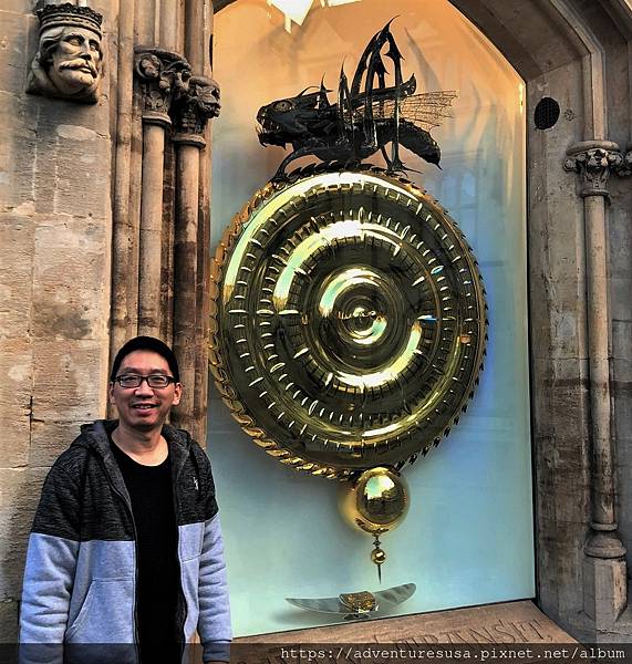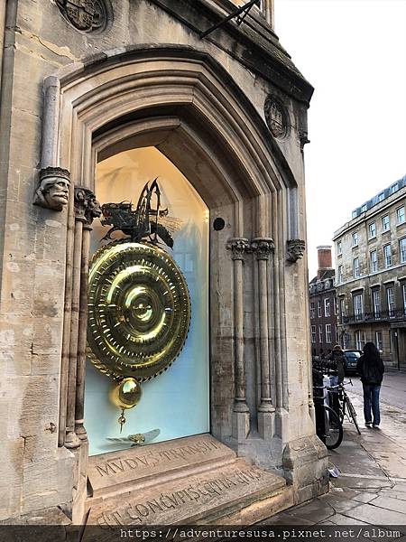 再往前走幾步路的街角, 看到有名的 Corpus Clock。叫做 Corpus Clock 因為它在劍橋大學 Corpus Christi 學院的圖書館外牆上。 也叫做 Grasshopper Clock (蚱蜢鐘)。