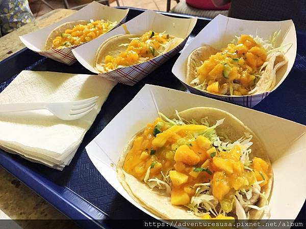 這次點了蝦塔可, 蝦肉被芒果和生菜蓋在下面。很有熱帶風情的口味。
