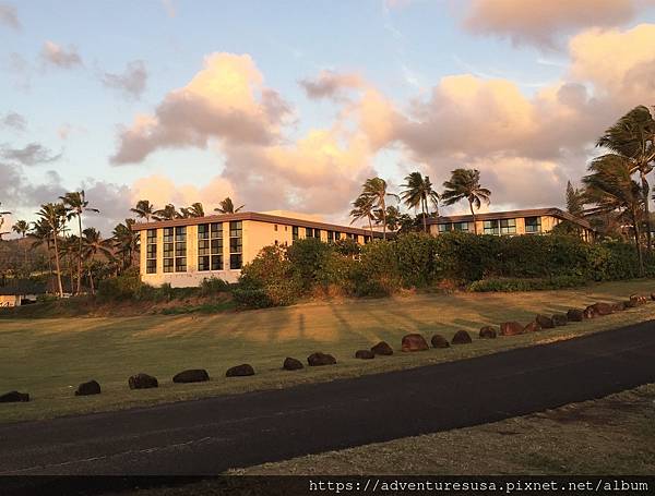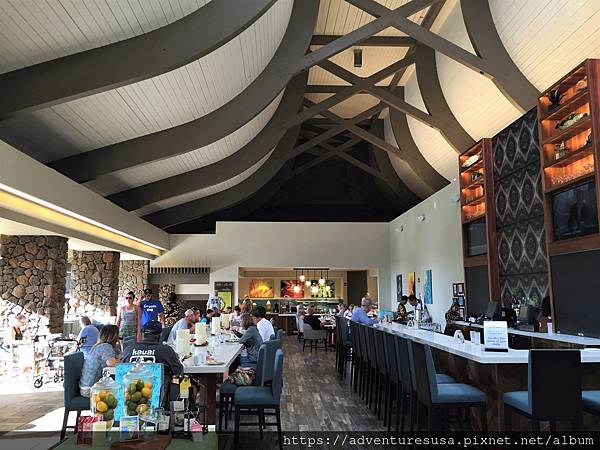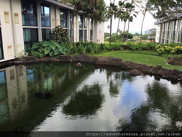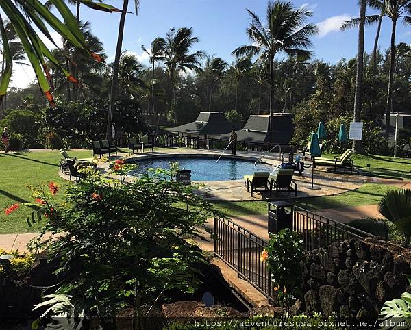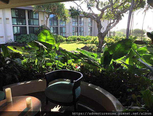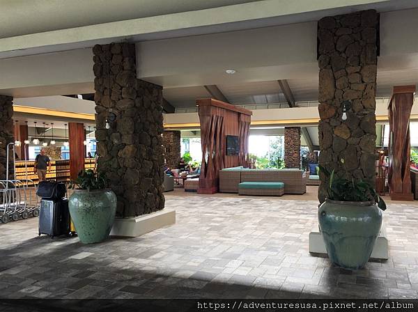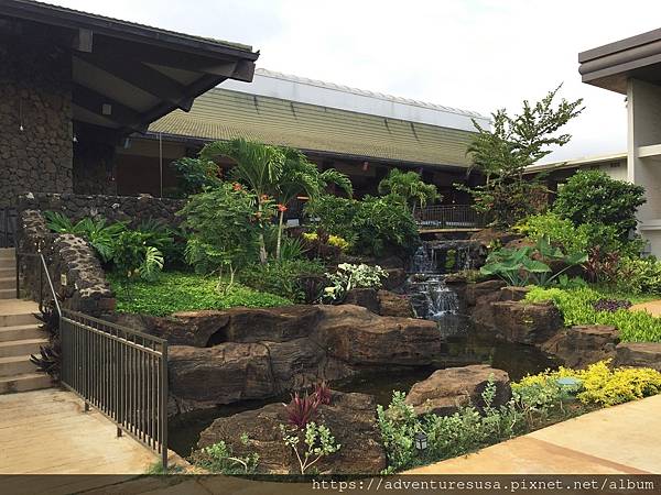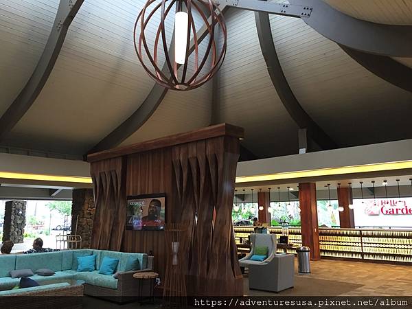 在夏威夷可愛島下榻的地點是希爾頓花園飯店 Hilton Garden Inn。飯店大廳沒有牆, 沒有玻璃門, 跟室外幾乎沒有任何隔離, 你就知道當地的天氣有多好, 真正的四季如春。