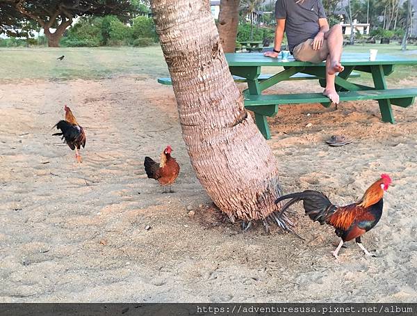 野雞也來看日出囉! 隨處逛大街的雞隻是夏威夷常見景象。