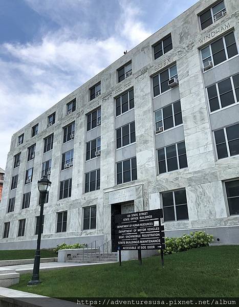 正對面是州政府辦公大樓。內有人事部門,汽車監理所部門, 設施維修部門, 還有船隻和摩托雪橇登記部門。 佛蒙特州位置偏北, 冬季冷冽多雪, 摩托雪撬是很方便的交通工具。