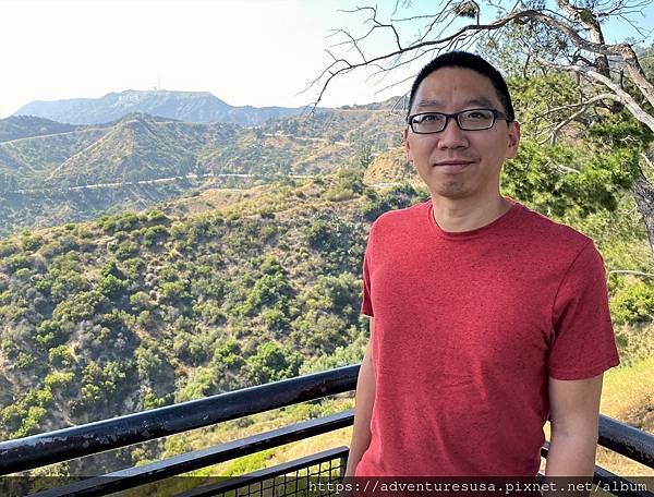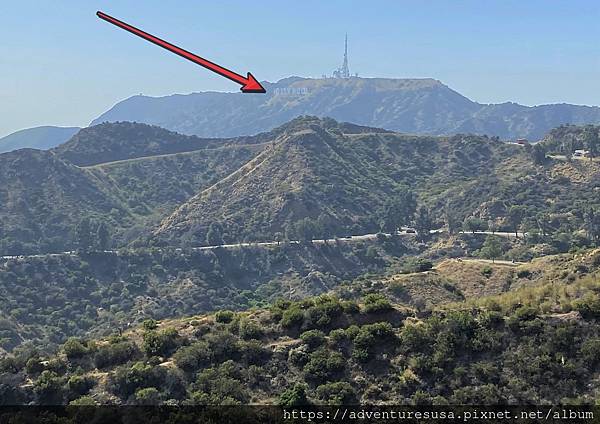 到底跟啥合照啦! 原來是著名的 Hollywood 好萊塢字樣。1923 年起就佇立在對面山上, 原本是一家地產商的廣告噱頭, 後來變成洛杉磯最經典景致。1978 年由更堅固耐久的鋼材取代。