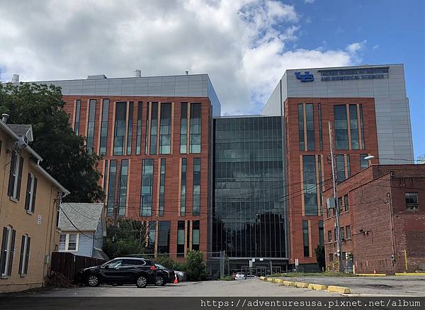 水牛城市中心的 UB 醫學院, 嶄新大樓於 2017 年年底啟用。水牛城位於五大湖之一伊利湖湖畔, 冬季寒冷多雪。該市人口約 25 萬, 離紐約市車程六個半小時, 前往美加邊境的尼加拉大瀑布只需半小時。