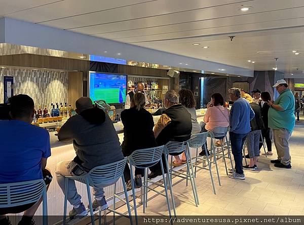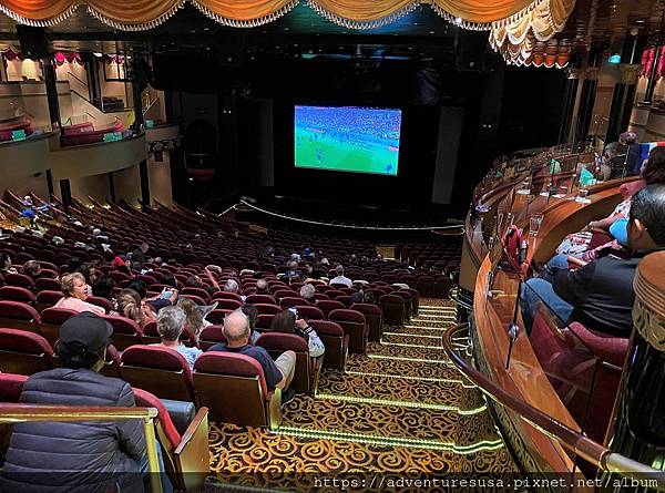 剛好碰上足球世界盃開打, 船上不少關心賽事的歐洲和拉丁美洲乘客, 開幕戰特別在劇院大螢幕播放。