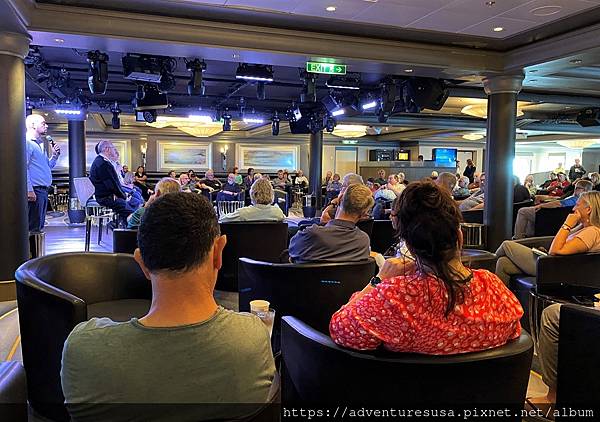 不定時的活動包括賓果遊戲, 益智問答等等。上圖這個活動是船長副船長 Q&A, 所有乘客都能參與, 詢問船上大小事, 非常有意思。Q&A 是由 Cruise Director 主持。