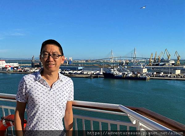 這天靠岸西班牙 Cadiz, 阿甘後方是全西班牙最長的橋樑。阿甘和不少郵輪乘客經由這座橋樑前往一個半小時車程的大城賽維爾。接下來聊聊為什麼這一次的郵輪行異常精實。