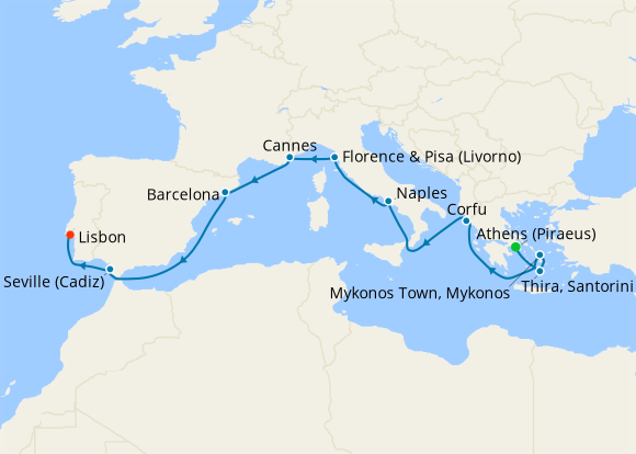 十二天的郵輪行程從雅典開始, 然後到聖托里尼, 米克諾斯, Corfu, 那不勒斯, Livorno (比薩), 坎城, 巴塞隆納, Cadiz (賽維爾), 最後在里斯本下船結束。只有兩天在海上閒閒無事, 其他日子都是在觀光, 非常緊湊。