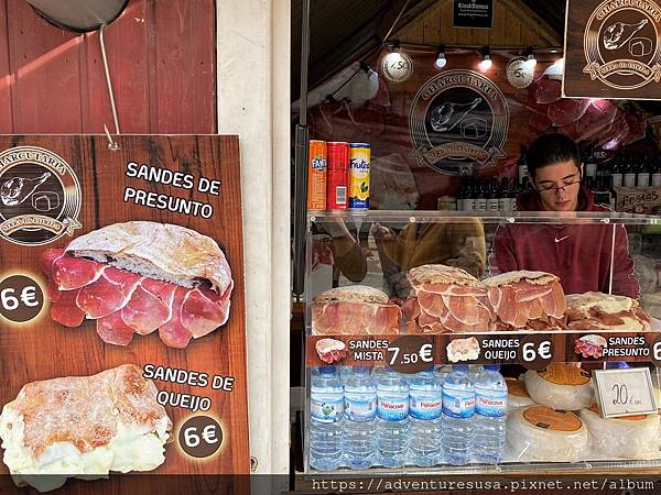 多數攤位賣吃的。這一攤賣三明治, 有火腿口味, 起司口味, 綜合口味。三明治裡面的火腿也太澎湃了吧!