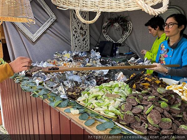 巧克力糖果攤。商家把長長的木杓伸到每個經過的人面前, 提供試吃。